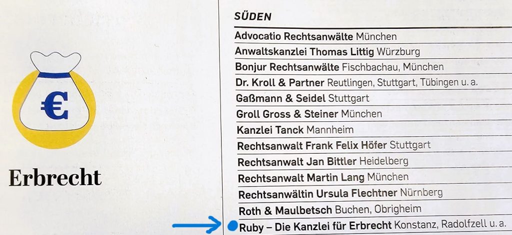 Erbrechtkanzlei Ruby – Wir machen nur Erbrecht – Wir helfen Ihnen – Überall in Deutschland – Tel. 07721 / 9930505