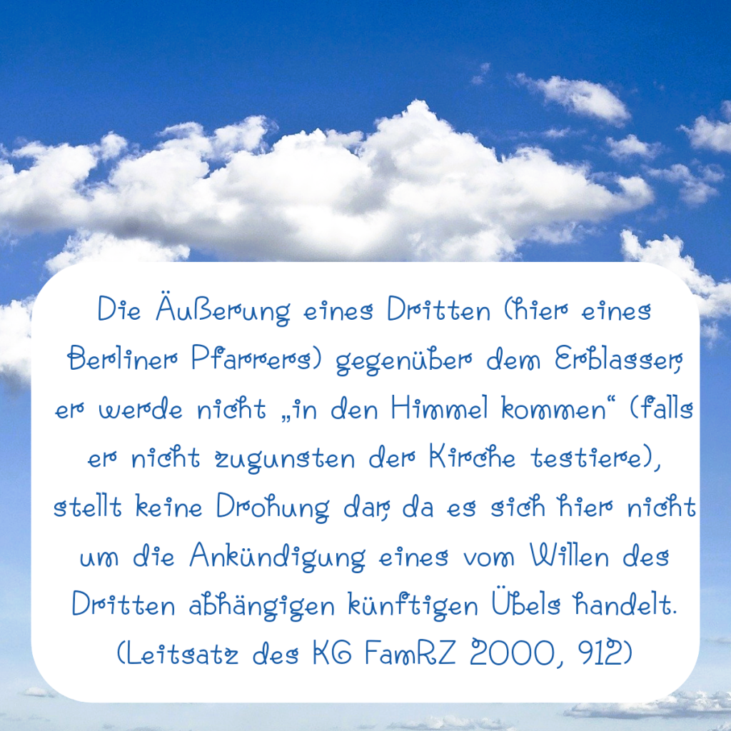 Die Äußerung eines Dritten (hier eines Berliner Pfarrers) gegenüber dem Erblasser, er werde nicht „in den Himmel kommen“ (falls er nicht zugunsten der Kirche testiere), stellt keine Drohung dar, da es sich hier nicht um die Ankündigung eines vom Willen des Dritten abhängigen künftigen Übels handelt.